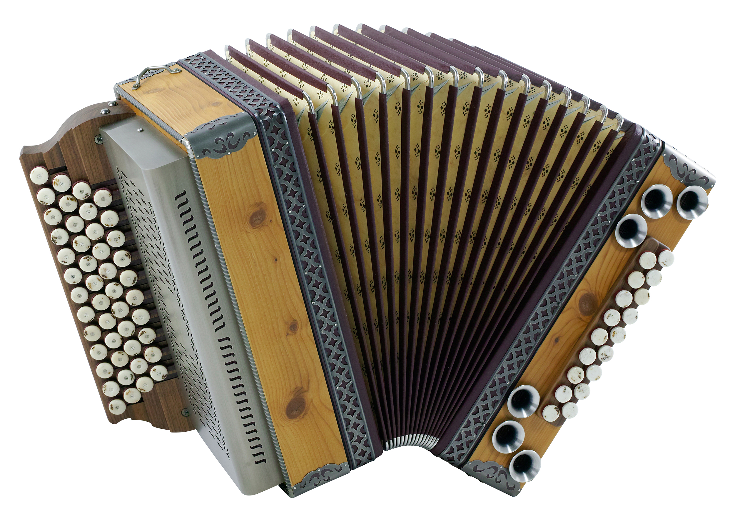 Balgrahmen in Holz, verschiedene Knöpfe aus Horn oder Holz, Beschläge in Altsilber oder Altmessing, sowie weitere Zusatzbässe und Koppelungen. Zusätzliches Holzverdeck in verschiedenen Varianten und Gestaltungsmöglichkieten.
