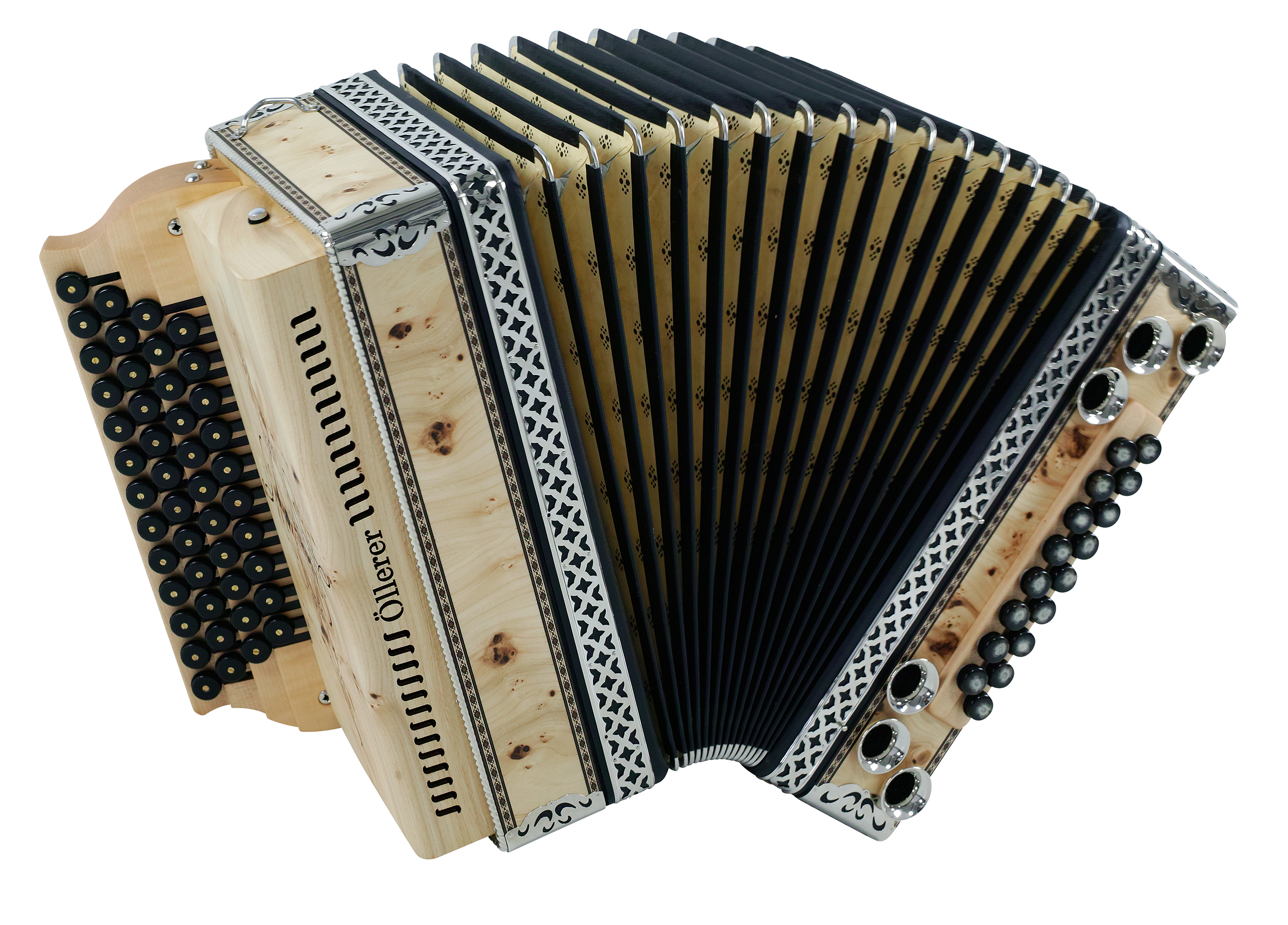 Sie können bei Luxus / Solist Modellen aus verschiedenen Holzarten, Balgfarben und Stoffen auswählen. Stimmung, Tastenbelegung und alle Balgfarben und Balg-Papiere und -Stoffe Tremolostufen sind im Grundpreis enthalten. Metallbeschläge in der Optik "hochglanzvernickelt", sowie Kunststoffknöpfe sind ohne Aufpreis erhältlich.