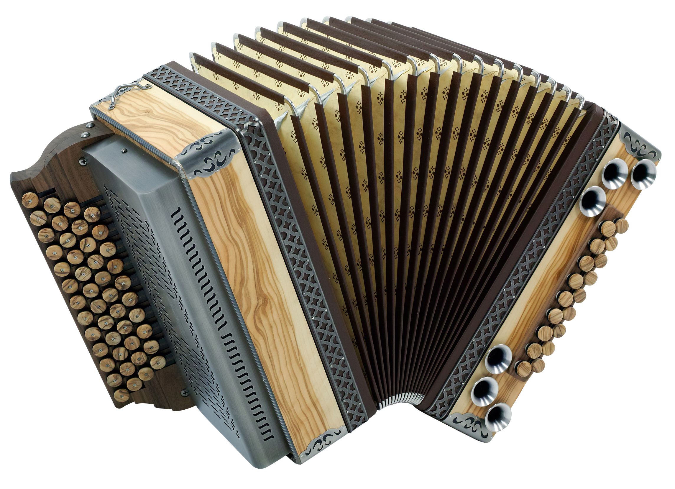 Balgrahmen in Holz, verschiedene Knöpfe aus Horn oder Holz, Beschläge in Altsilber oder Altmessing, sowie weitere Zusatzbässe und Koppelungen. Zusätzliches Holzverdeck in verschiedenen Varianten und Gestaltungsmöglichkieten.