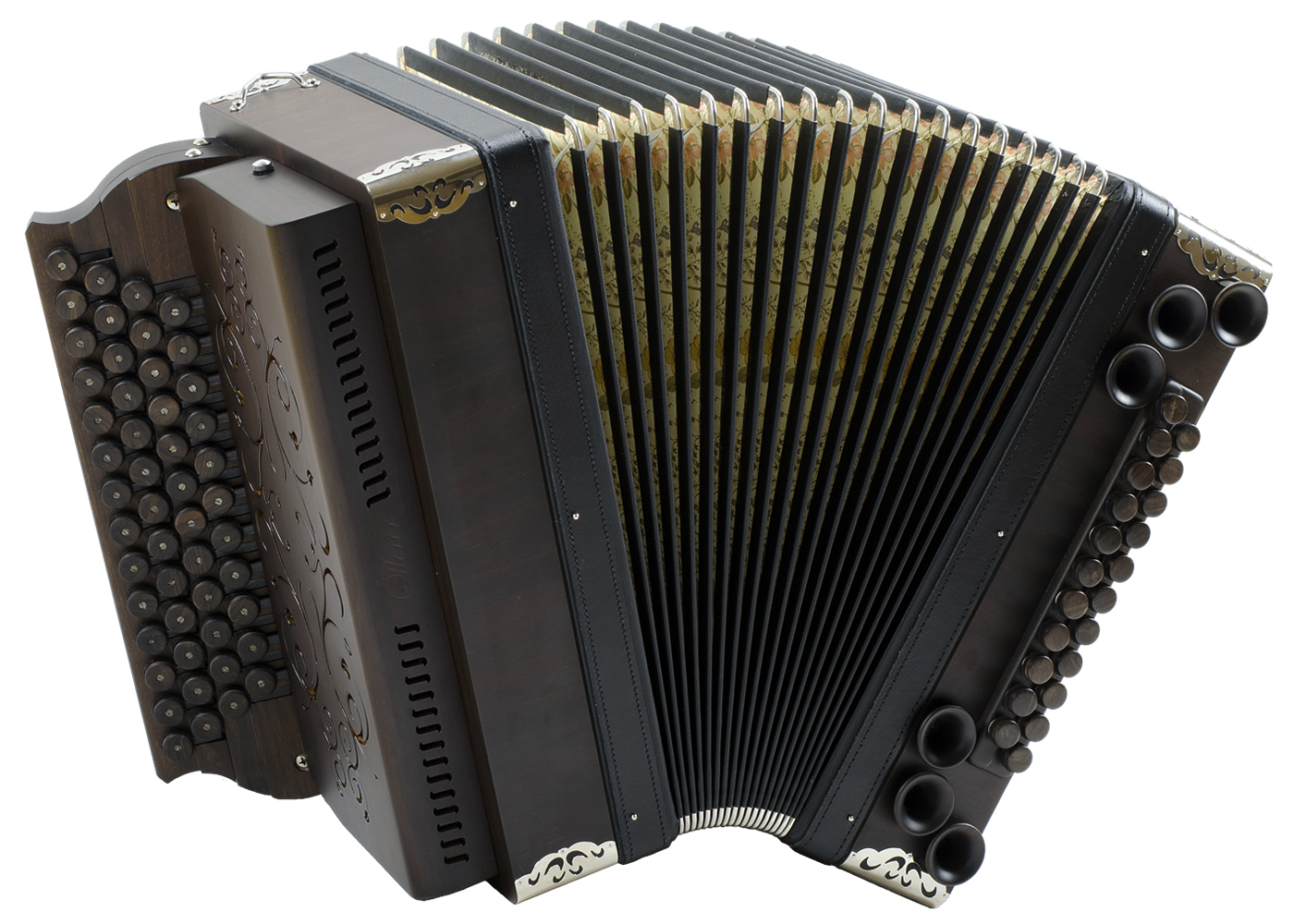 Balgrahmen in Holz, verschiedene Knöpfe aus Horn oder Holz, Beschläge in Altsilber oder Altmessing, sowie weitere Zusatzbässe und Koppelungen. Zusätzliches Holzverdeck in verschiedenen Varianten und Gestaltungsmöglichkieten.