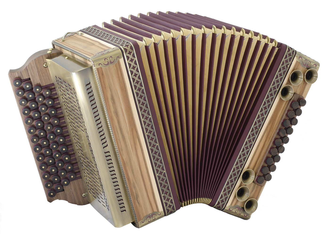 Balgrahmen in Holz, verschiedene Knöpfe aus Horn oder Holz, Beschläge in Altsilber oder Altmessing, sowie weitere Zusatzbässe und Koppelungen. Zusätzliches Holzverdeck in verschiedenen Varianten und Gestaltungsmöglichkieten.