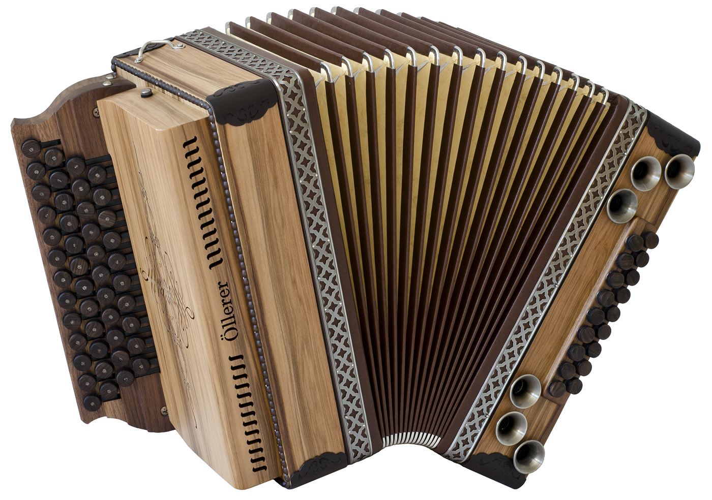 Balgrahmen in Holz, verschiedene Knöpfe aus Horn oder Holz, Beschläge in Altsilber oder Altmessing, sowie weitere Zusatzbässe und Koppelungen. Zusätzliches Holzverdeck in verschiedenen Varianten und Gestaltungsmöglichkieten.