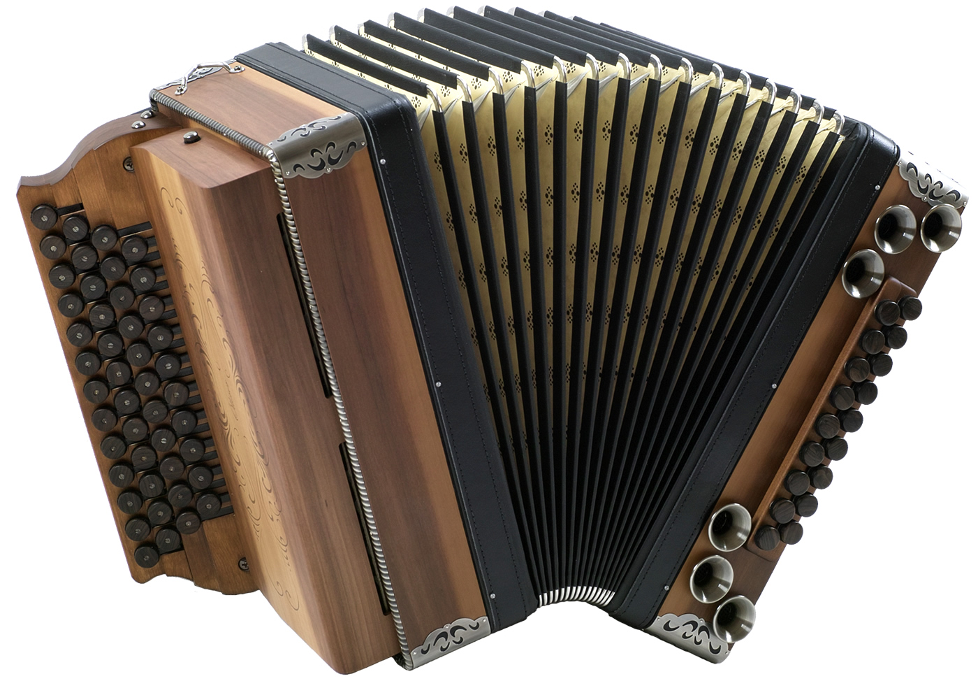 Balgrahmen in Holz, verschiedene Knöpfe aus Horn oder Holz, Beschläge in Altsilber oder Altmessing, sowie weitere Zusatzbässe und Koppelungen. Zusätzliches Holzverdeck in verschiedenen Varianten und Gestaltungsmöglichkieten.