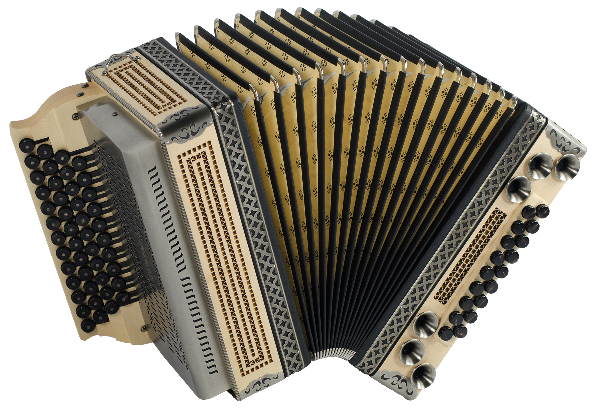 Balgrahmen in Holz, verschiedene Knöpfe aus Horn oder Holz, Beschläge in Altsilber oder Altmessing, sowie weitere Zusatzbässe und Koppelungen. Zusätzliches Holzverdeck in verschiedenen Varianten und Gestaltungsmöglichkieten.