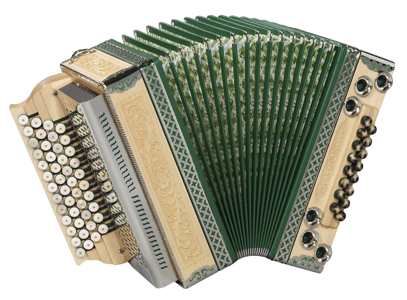 Sie können bei Luxus / Solist Modellen aus verschiedenen Holzarten, Balgfarben und Stoffen auswählen. Stimmung, Tastenbelegung und alle Balgfarben und Balg-Papiere und -Stoffe Tremolostufen sind im Grundpreis enthalten. Metallbeschläge in der Optik "hochglanzvernickelt", sowie Kunststoffknöpfe sind ohne Aufpreis erhältlich.