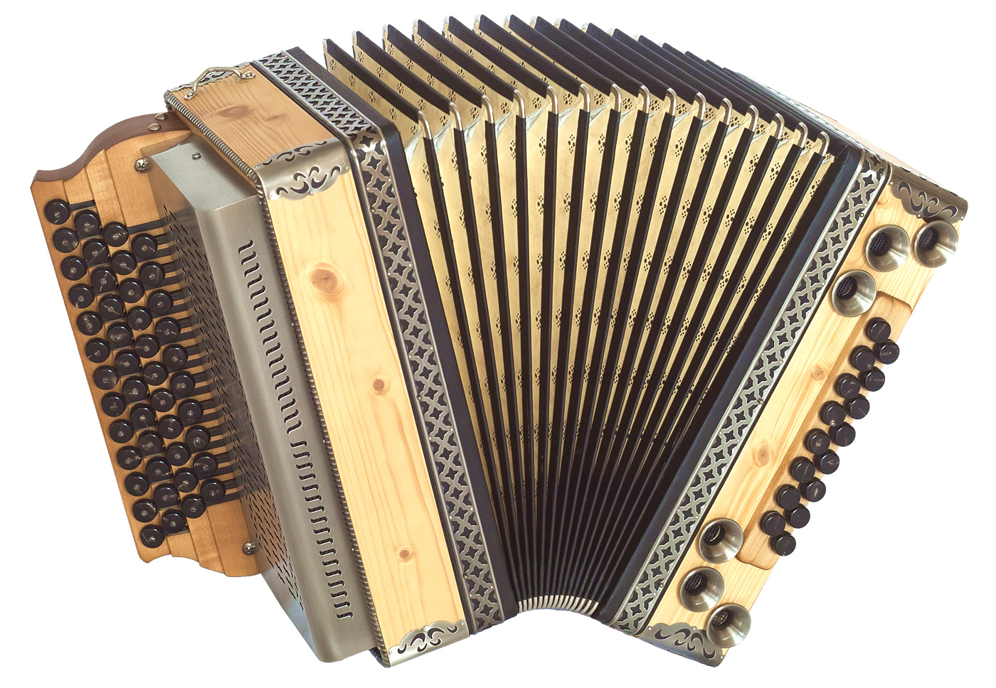 Balgrahmen in Holz, verschiedene Knöpfe aus Horn oder Holz, Beschläge in Altsilber oder Altmessing, sowie weitere Zusatzbässe und Koppelungen. Zusätzliches Holzverdeck in verschiedenen Varianten und Gestaltungsmöglichkieten.