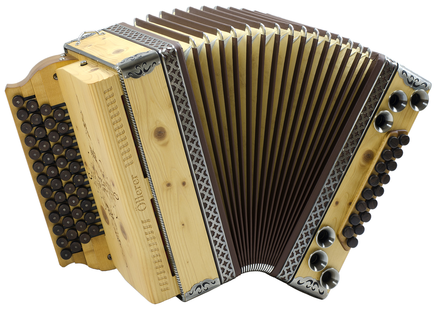 Balgrahmen in Holz, verschiedene Knöpfe aus Horn oder Holz, Beschläge in Altsilber oder Altmessing, sowie weitere Zusatzbässe und Koppelungen. Zusätzliches Holzverdeck in verschiedenen Varianten und Gestaltungsmöglichkieten.