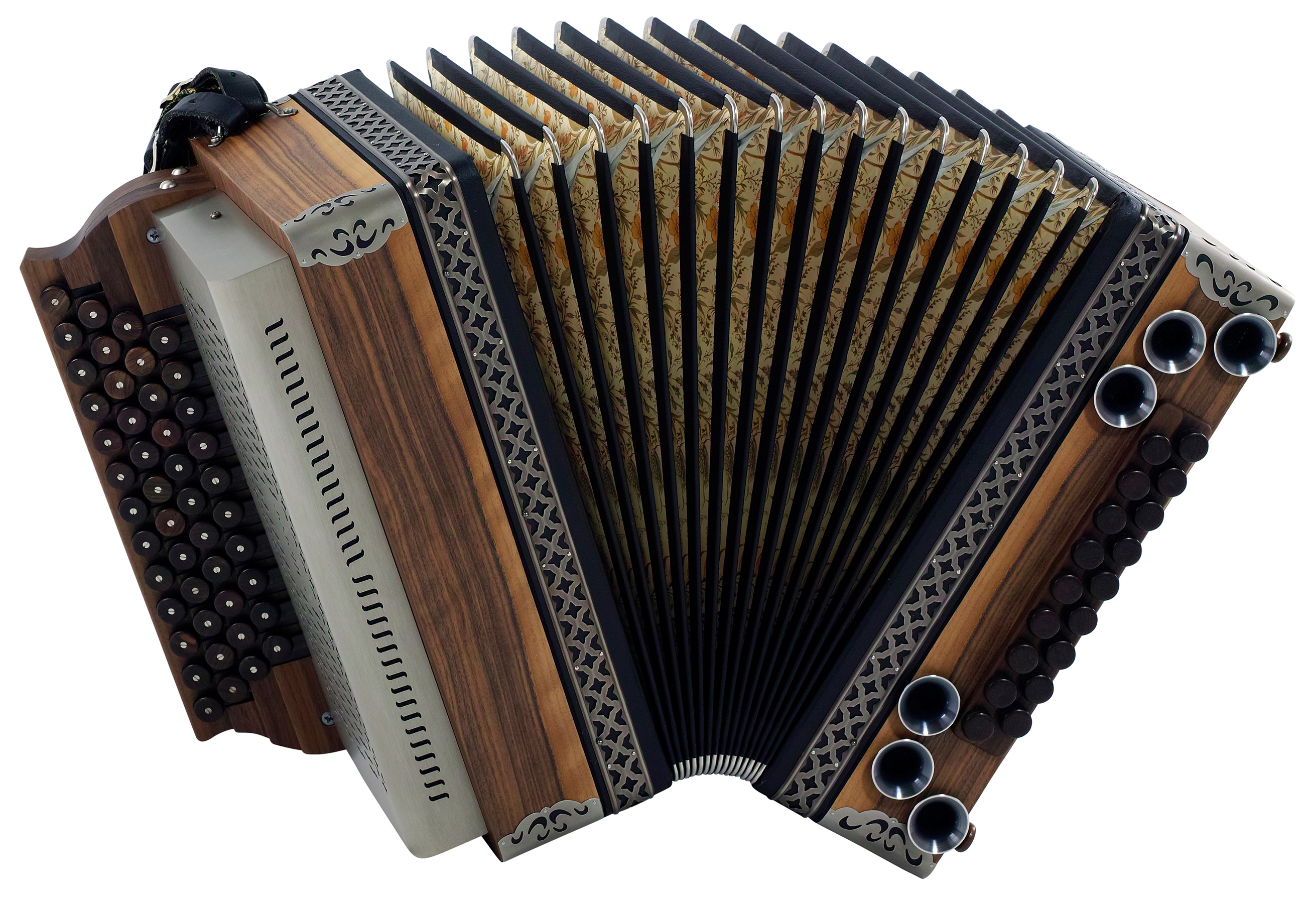 Diskant- und Bassknöpfe aus Grenadill, Altsilber Beschläge, 1 Zusatzbass und 1 Koppelung