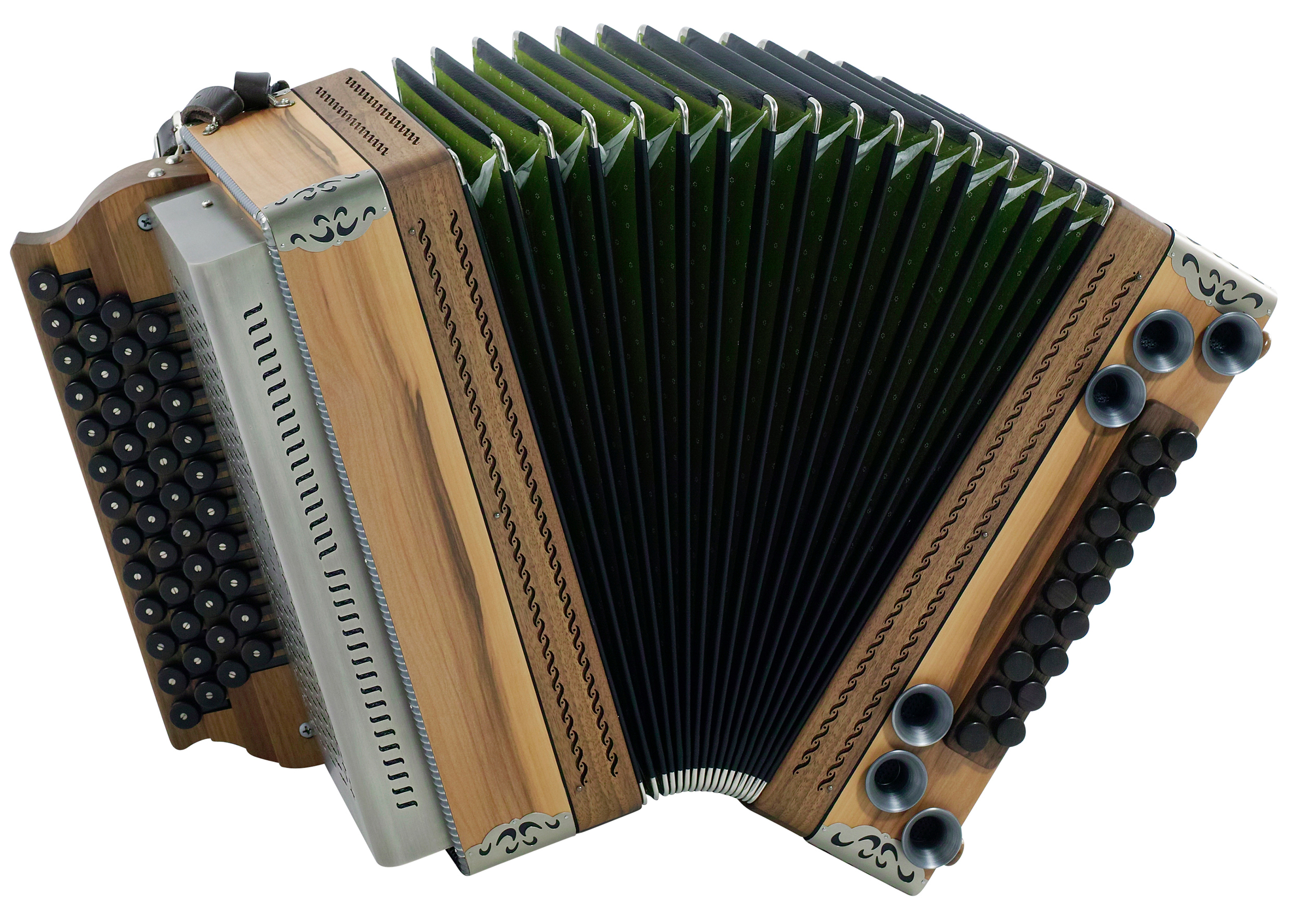 Diskant- und Bassknöpfe aus Grenadill, Holzbalgrahmen, Altsilber Beschläge, 1 Zusatzbass und 1 Koppelung
