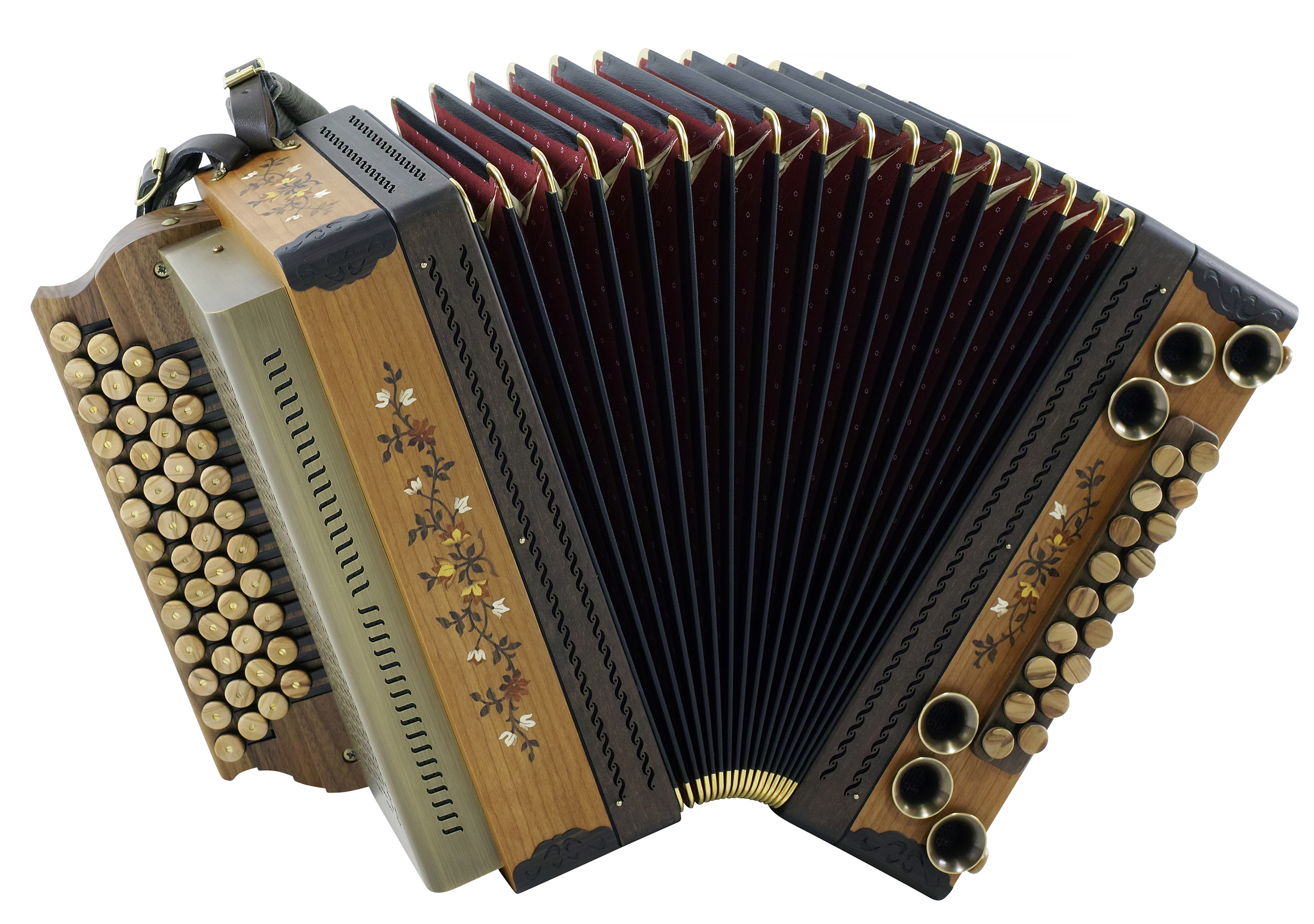 Diskantknöpfe und Baßknöpfe aus Holz, Beschläge Altmessing patiniert, Kantenschutz und Balgrahmen Holz gelasert, 1 Zusatzbass und 1 Basskoppelung