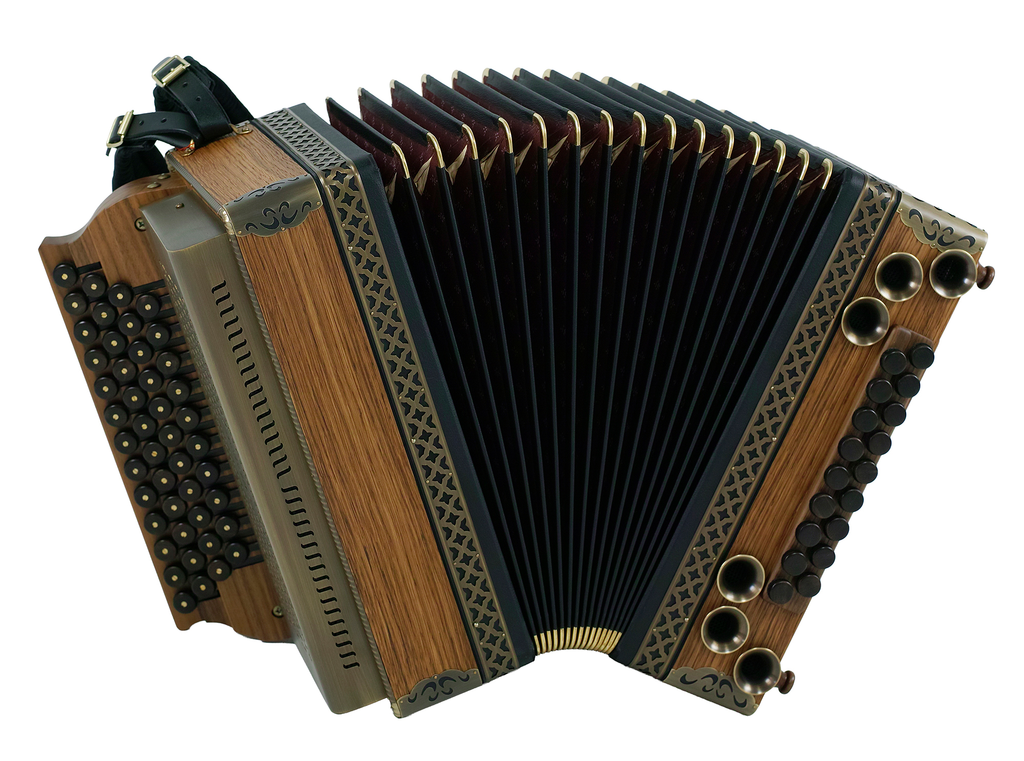 Diskant- und Bassknöpfe aus Grenadill, Beschläge Altmessing patiniert, 1 Zusatzbass und 1 Basskoppelung