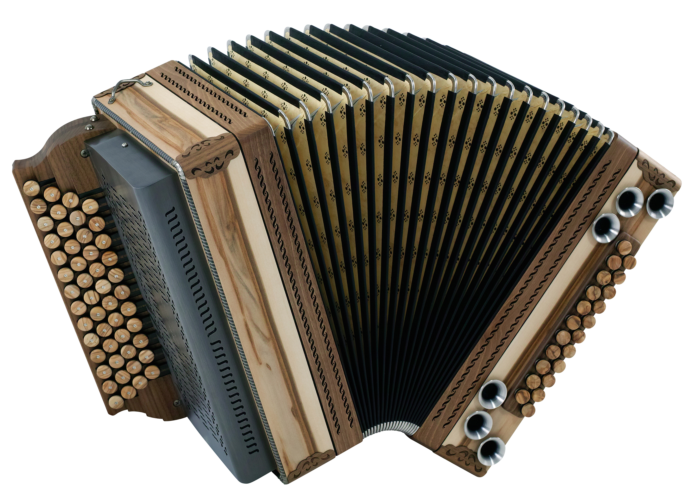 Diskant- und Bassknöpfe aus Olive, Kantenschutz Holz gelasert, Balgrahmen Holz, Altsilber Beschläge