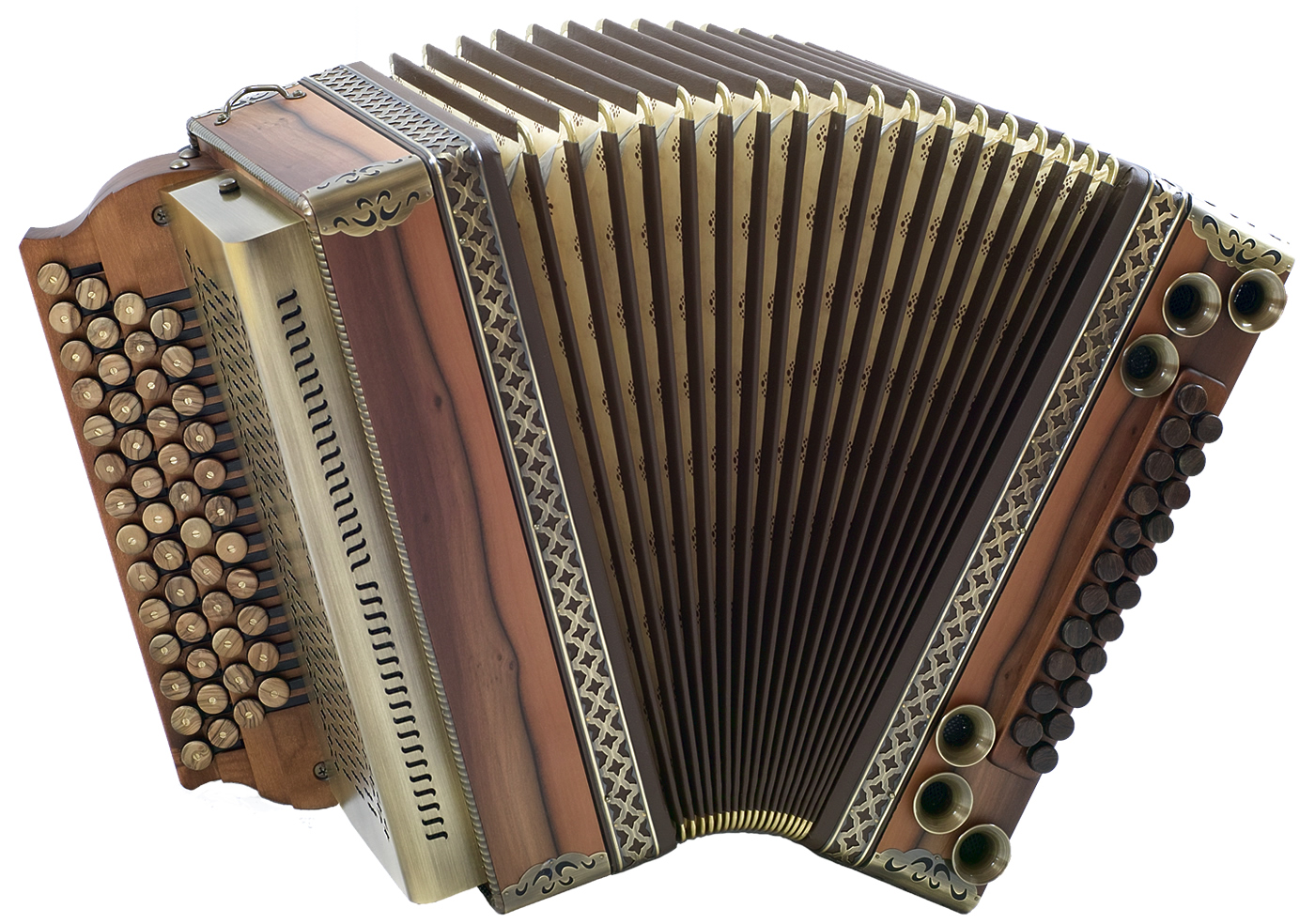 Beschläge Messing patiniert, Diskant- und Bassknöpfe aus Holz