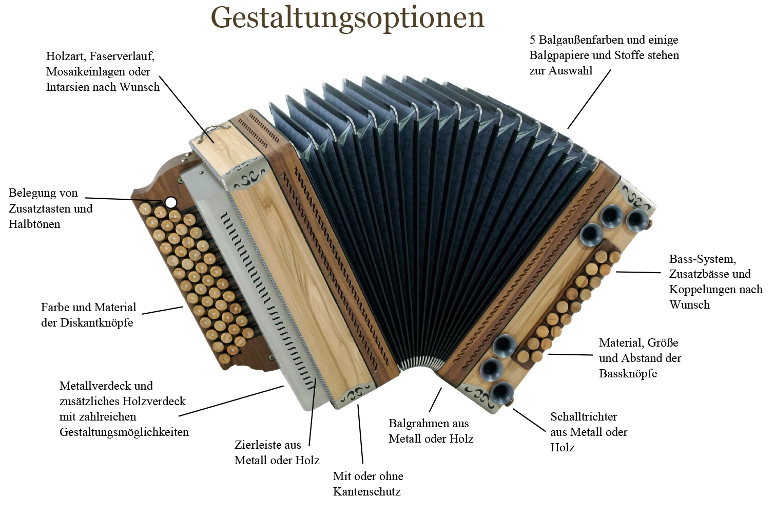 Sie können bei Luxus / Solist Modellen aus verschiedenen Holzarten, Balgfarben und Stoffen auswählen. Stimmung, Tastenbelegung und alle Balgfarben und Balg-Papiere und -Stoffe Tremolostufen sind im Grundpreis enthalten. Metallbeschläge in der Optik "hochglanzvernickelt", sowie Kunststoffknöpfe sind ohne Aufpreis erhältlich.